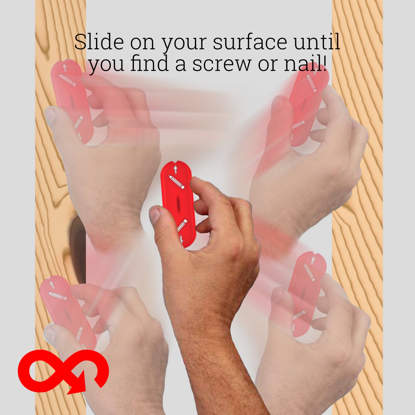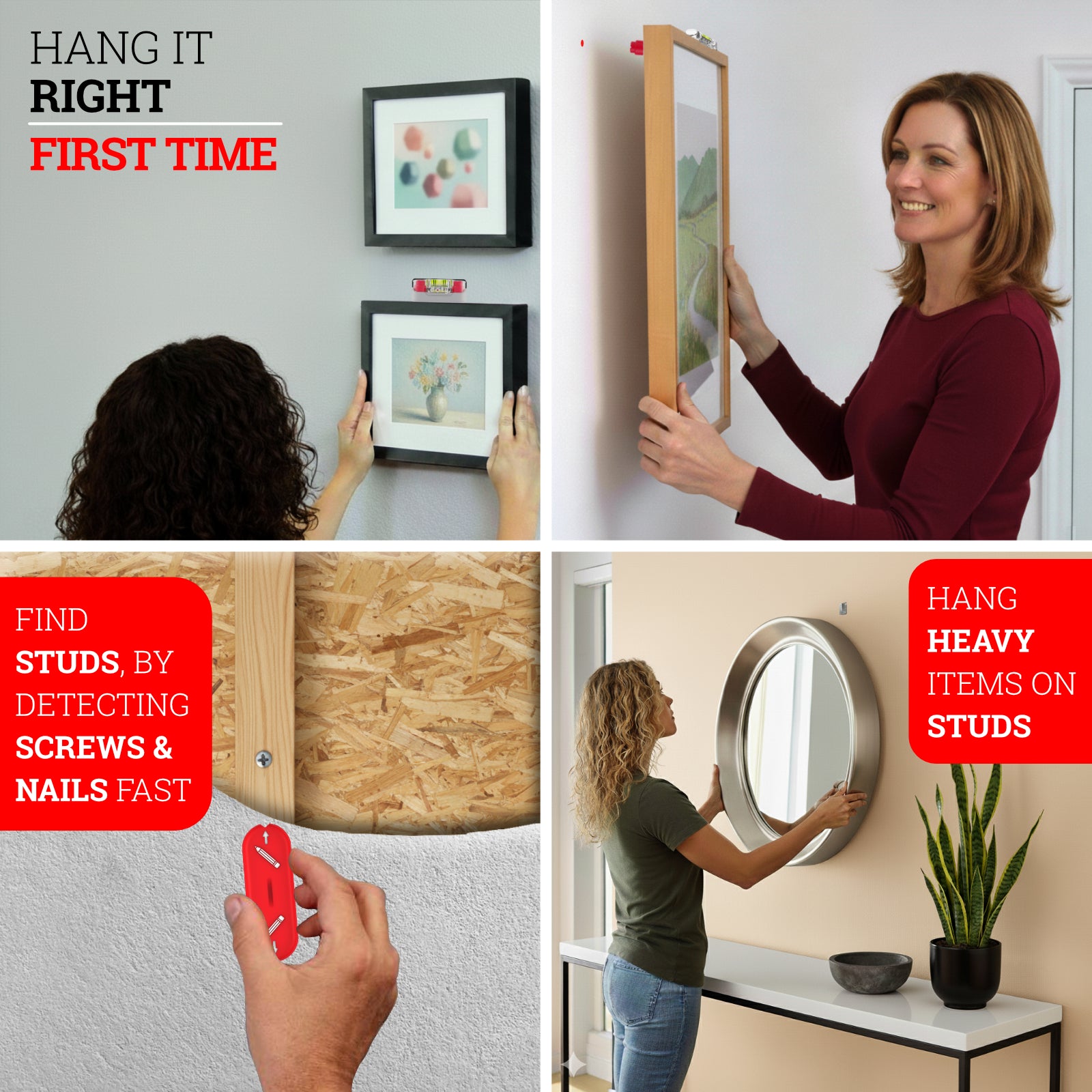 The Stud Finder uses a magnet to detect nails or screws in the wall, helping you find where the wooden studs are. These solid points give you a stronger, more secure place to hang heavier items.