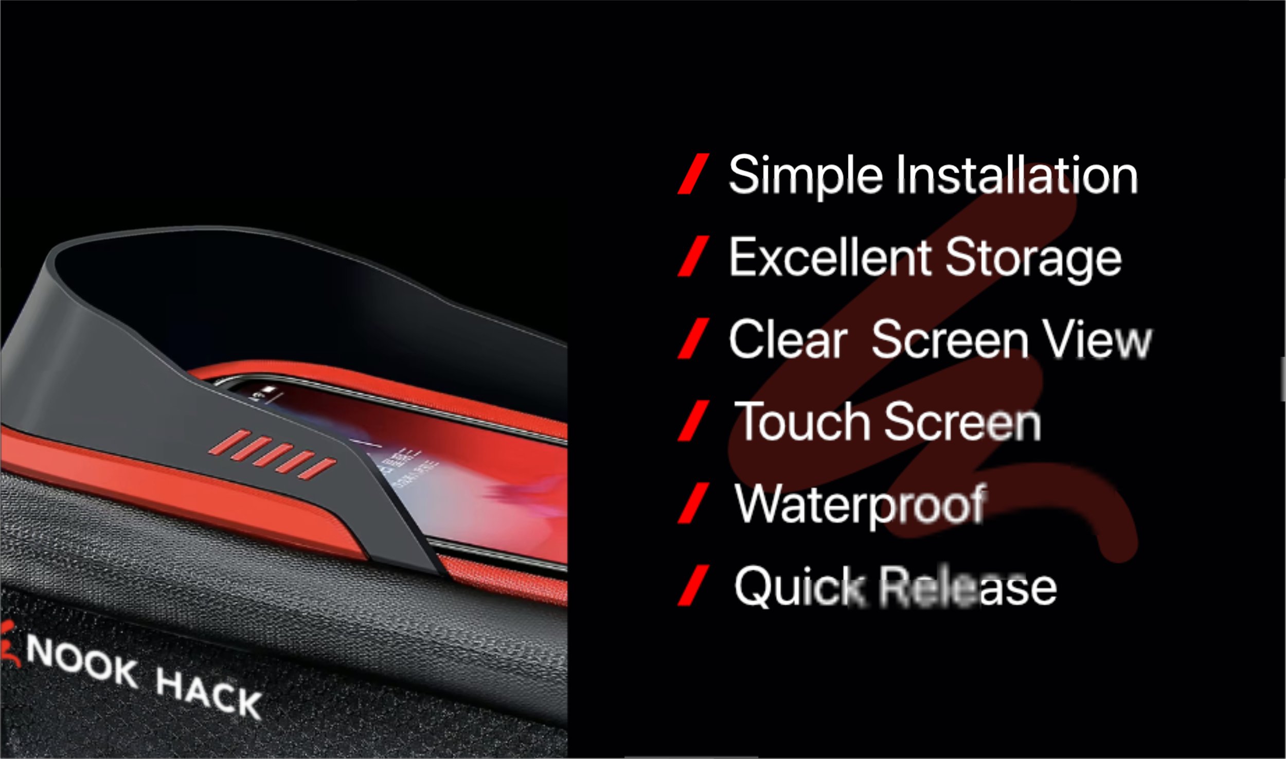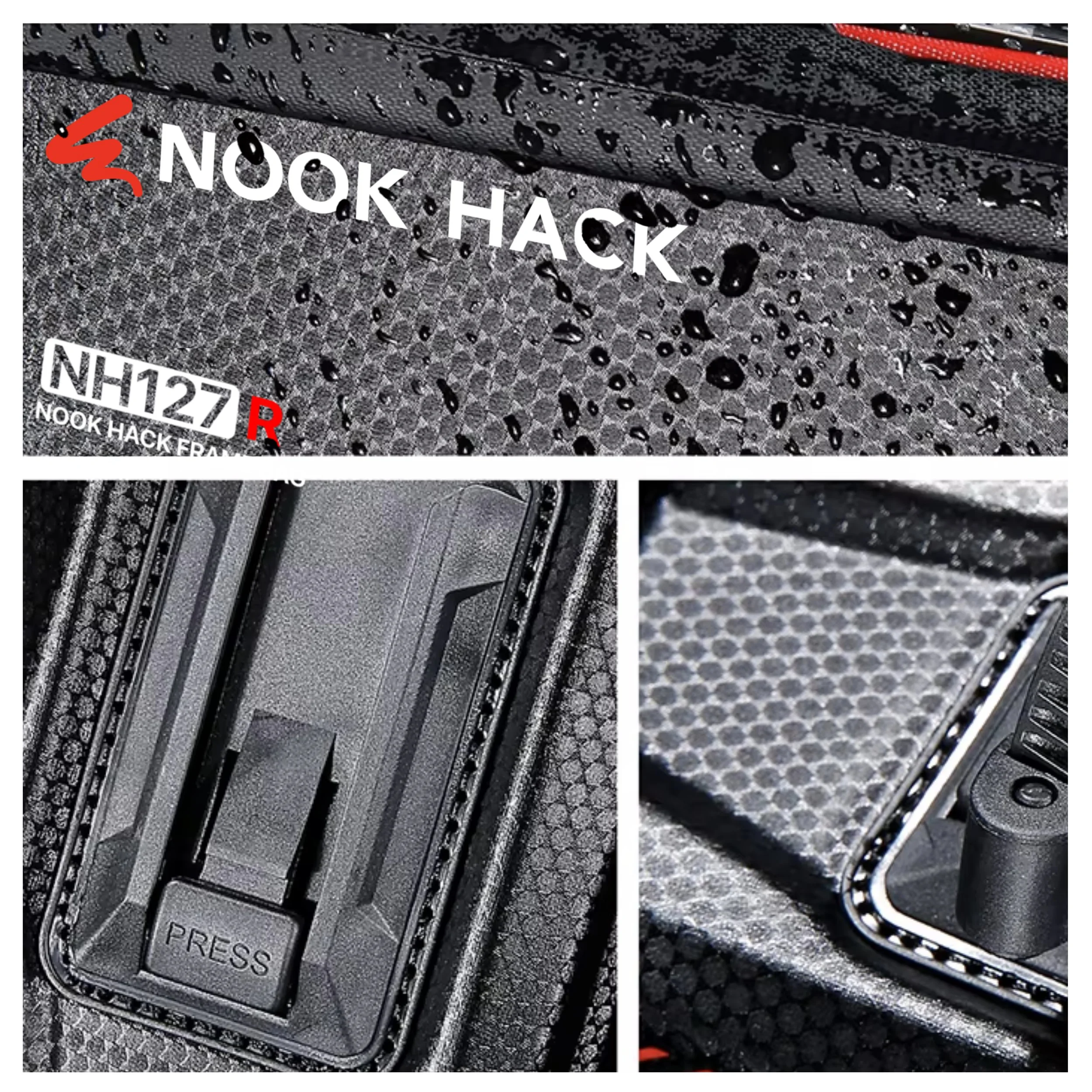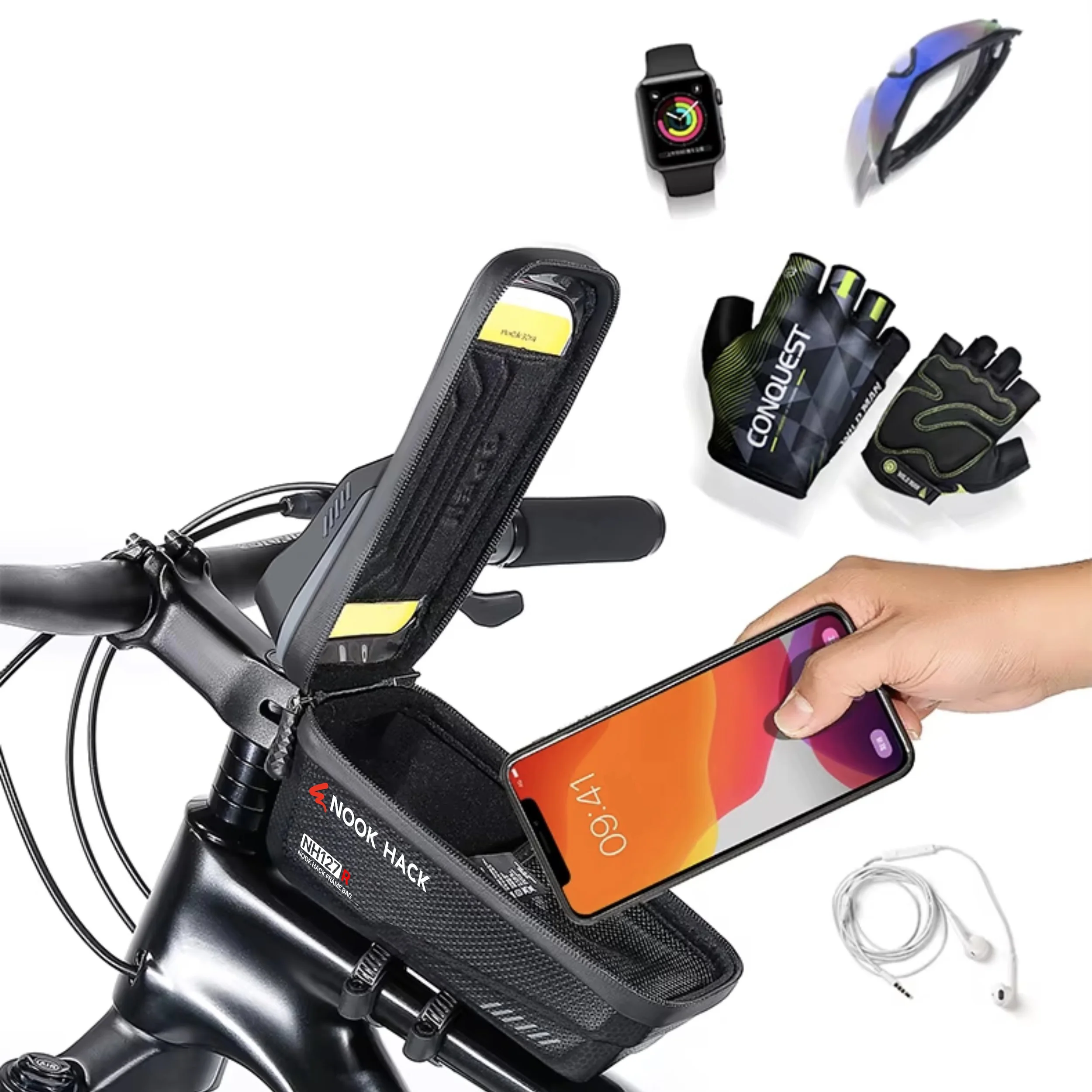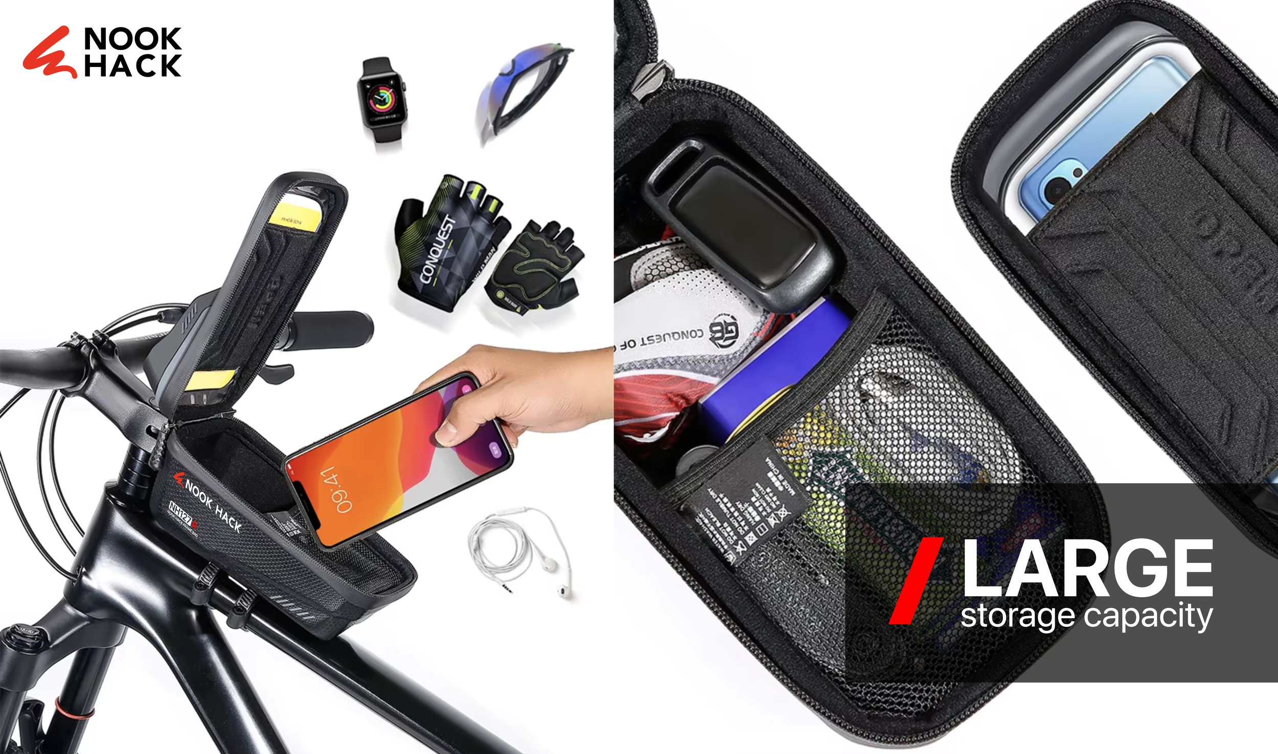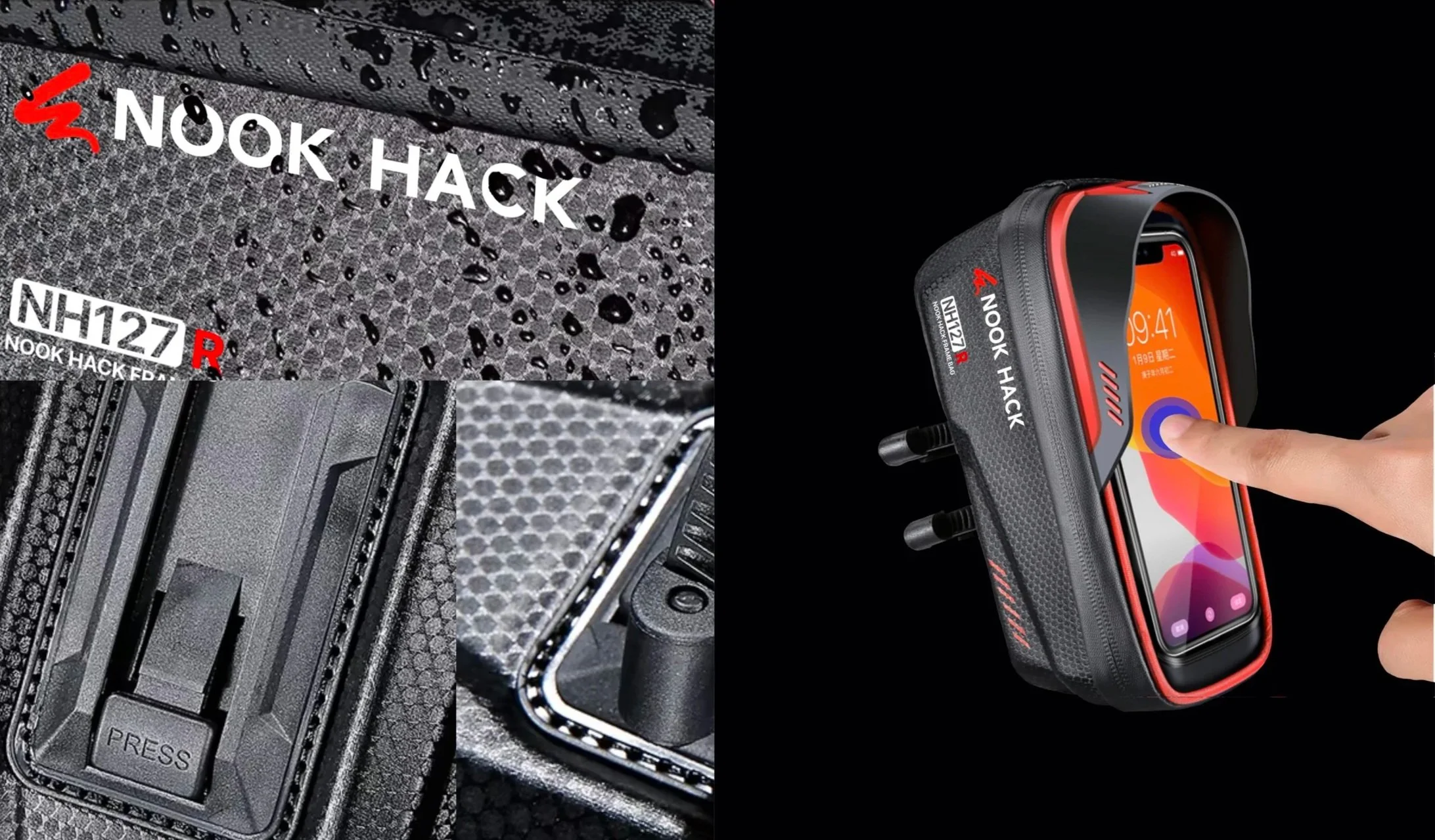 Waterproof: The Nook Hack bike phone holder waterproof bag for frame has a high resistance to water and snow. Great road bike phone holder and mountain bike phone holder.